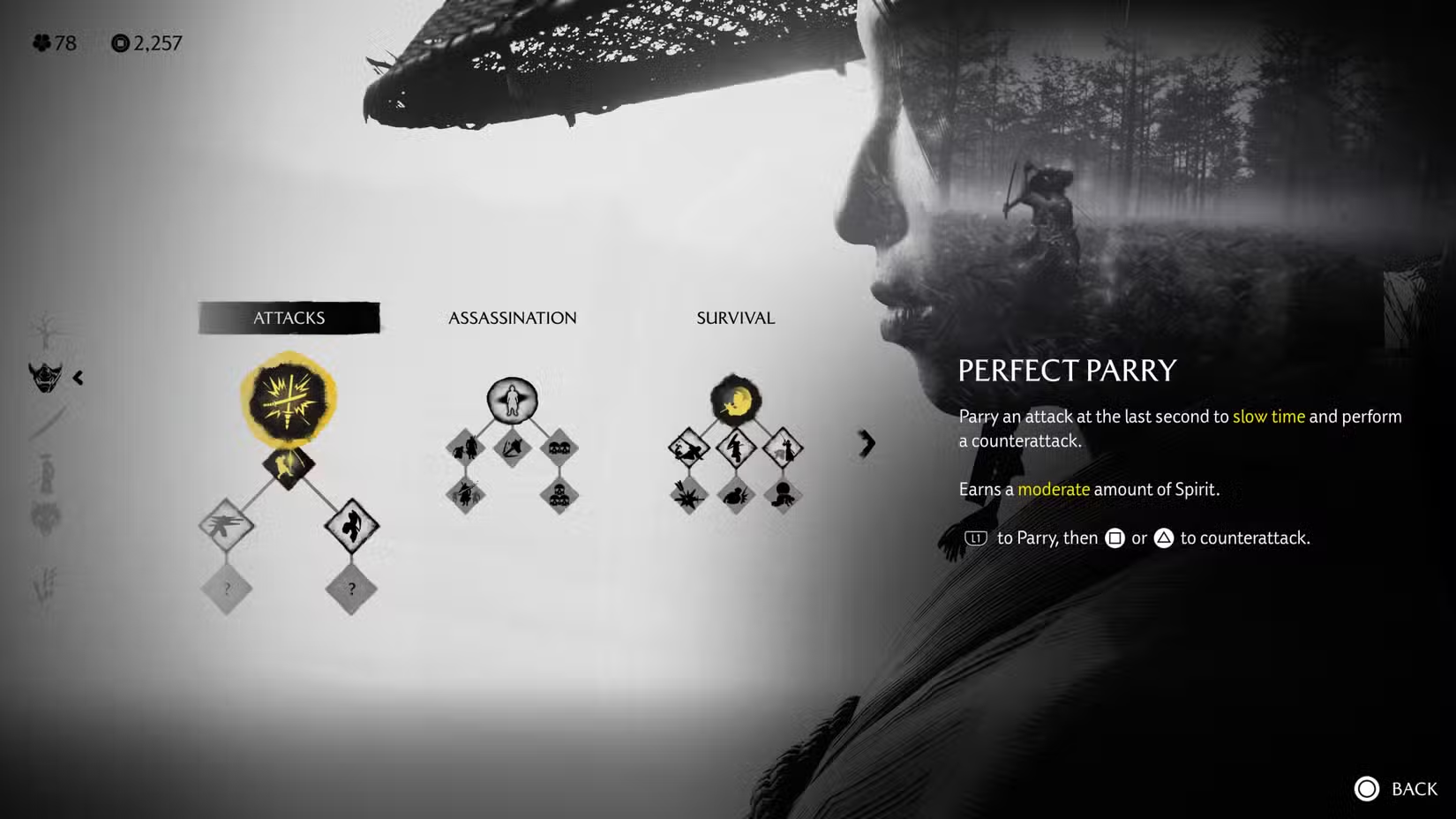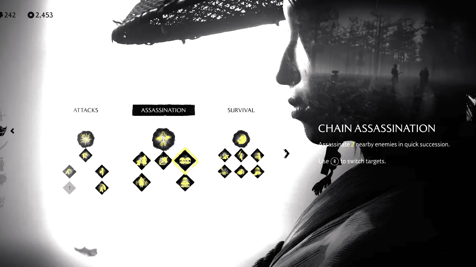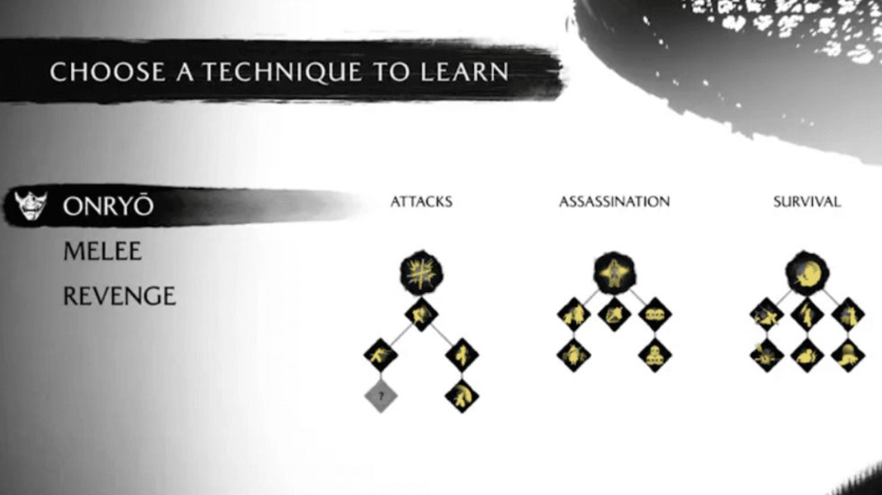 | Onryo skill trees | Techniques under Attacks, Assassination, Survival, and Ranged that embody the “vengeful spirit” toolkit raise your Onryo emphasis. Notable examples: Onryo’s Strike (disarm with a chance to terrify), Onryo’s Will (self-revive using Spirit), Perfect Parry/Perfect Dodge counters, and Concentration upgrades for ranged play. |