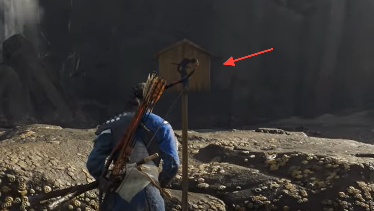 Yōtei scatters understated wooden signs that carry a simple bow motif. When you stop, face the sign, and bow, the game spawns ambient wildlife nearby and lets the scene breathe. Different signs cue different animals; the example northwest of the “Southern Coast” label calls in birds, while others surface frogs or mixed fauna. There’s no checklist payoff here — it’s a vibe switch you can use to punctuate a ride or a climb.