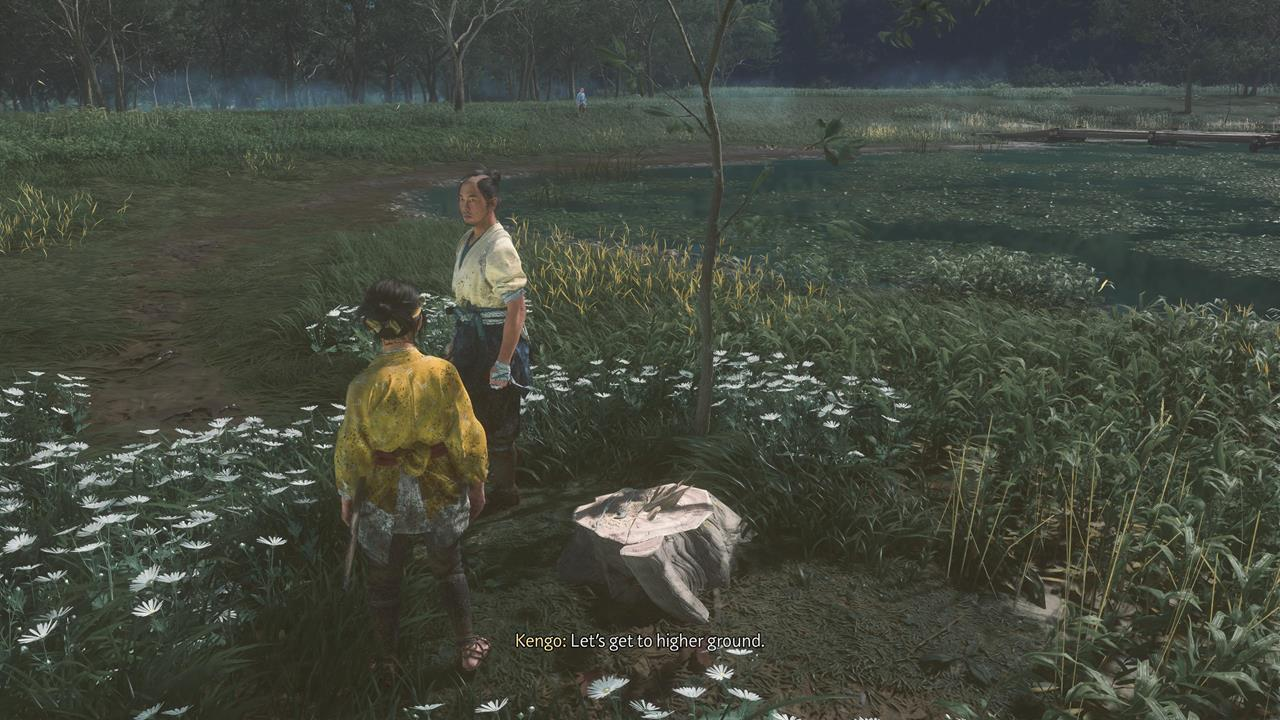 At the stables, speak to the settler to trigger a short scene. Lord Saito’s men arrive; you can hide in bushes to pick them off stealthily or take them head-on in melee. After the fight, follow the merchant to the nearby pond to relive Atsu’s memories in a flashback: