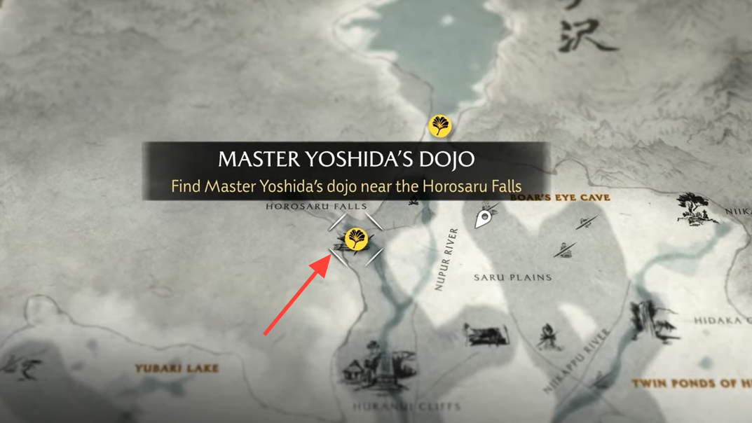 Complete The Old Inn in the Yotei Grasslands, then pursue clues tied to the Saito Brothers. When you’ve gathered enough, a Golden Ginkgo Leaf marker appears in the Tokachi Range near Horasaru Falls. Track it, ride north, and you’ll find Master Yoshida on the bridge to his dojo.