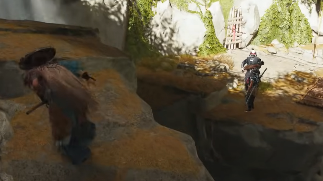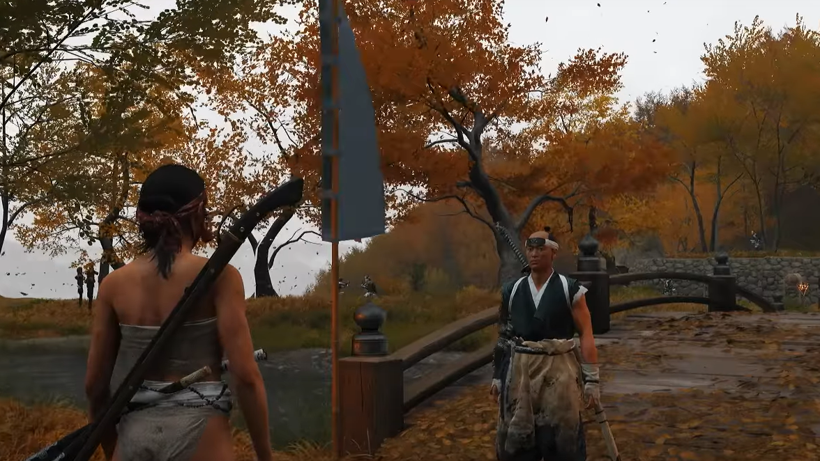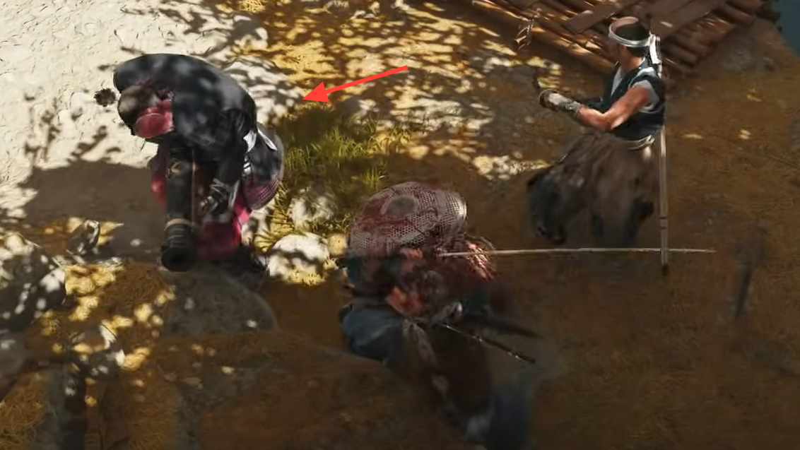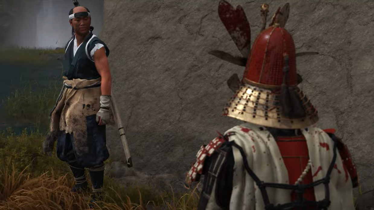 After you recruit Yoshida and take the weapon, Saito Outlaws push across the bridge. Cut down the opening Brute with Odachi heavies, then mop up the rest and follow Yoshida toward a nearby outlaw camp overlooking shallow water and split plateaus.