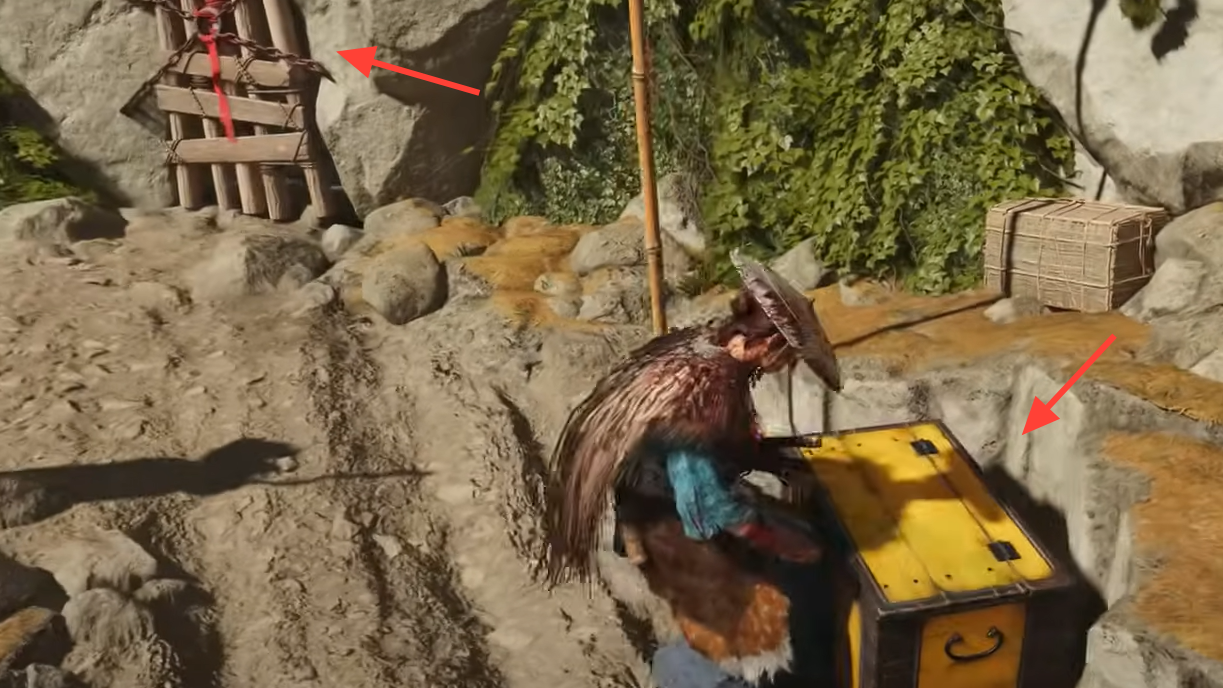 Grab Blind Bombs from the box near the ledge and open the small chest against the wall. Break the wooden barricade ahead with your grappling hook: hold R2 to set, then hold L2 and pull back to reveal the gap, and squeeze through.