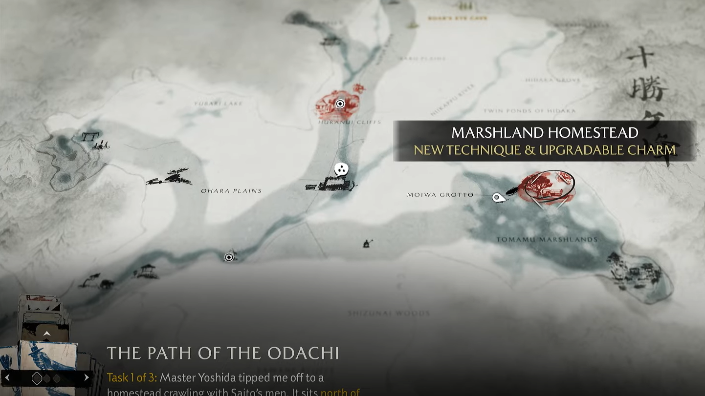 - The Path of the Odachi (Sensei Tale): Yoshida sends you to clean up Tokachi Range activities such as liberating the Marshland Homestead and Huranui Mill, and closing out the “Junpei the Snatcher” bounty, before reconvening at the dojo.