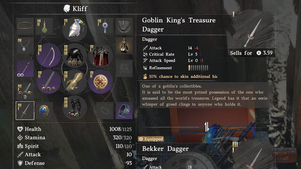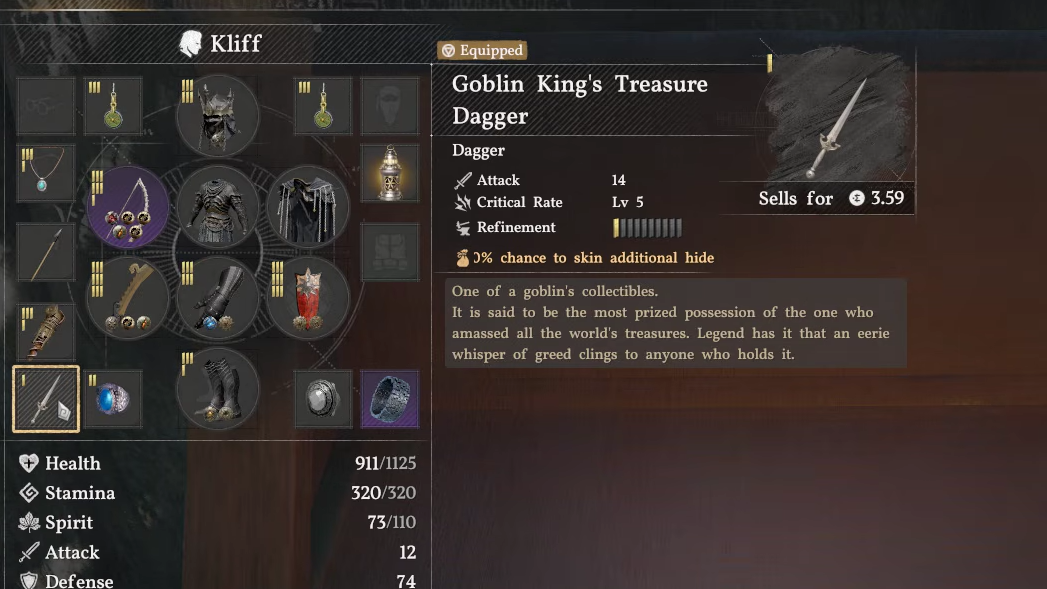Because the Mudridge Cabin is accessible relatively early in the game and the Pororin Forest Abyss Nexus provides a convenient fast travel point, there's little reason to delay grabbing this dagger. The 10% extra hide chance is a permanent quality-of-life improvement that compounds the more animals you skin. If you're investing in crafting or armor upgrades that require leather and hide, equipping the Goblin King's Treasure Dagger before you start farming materials will save you meaningful time over the course of a playthrough.