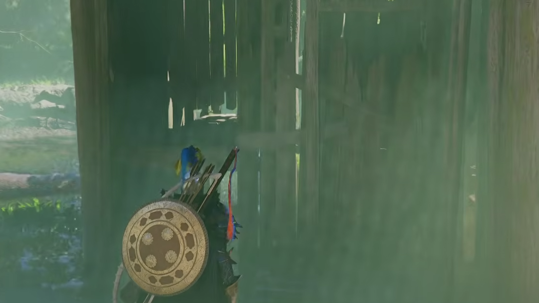 Step 4: Jump into the opening to enter a narrow corridor. Immediately crouch and move forward carefully. You'll need to sneak past a set of rotating wooden planks that block the path.