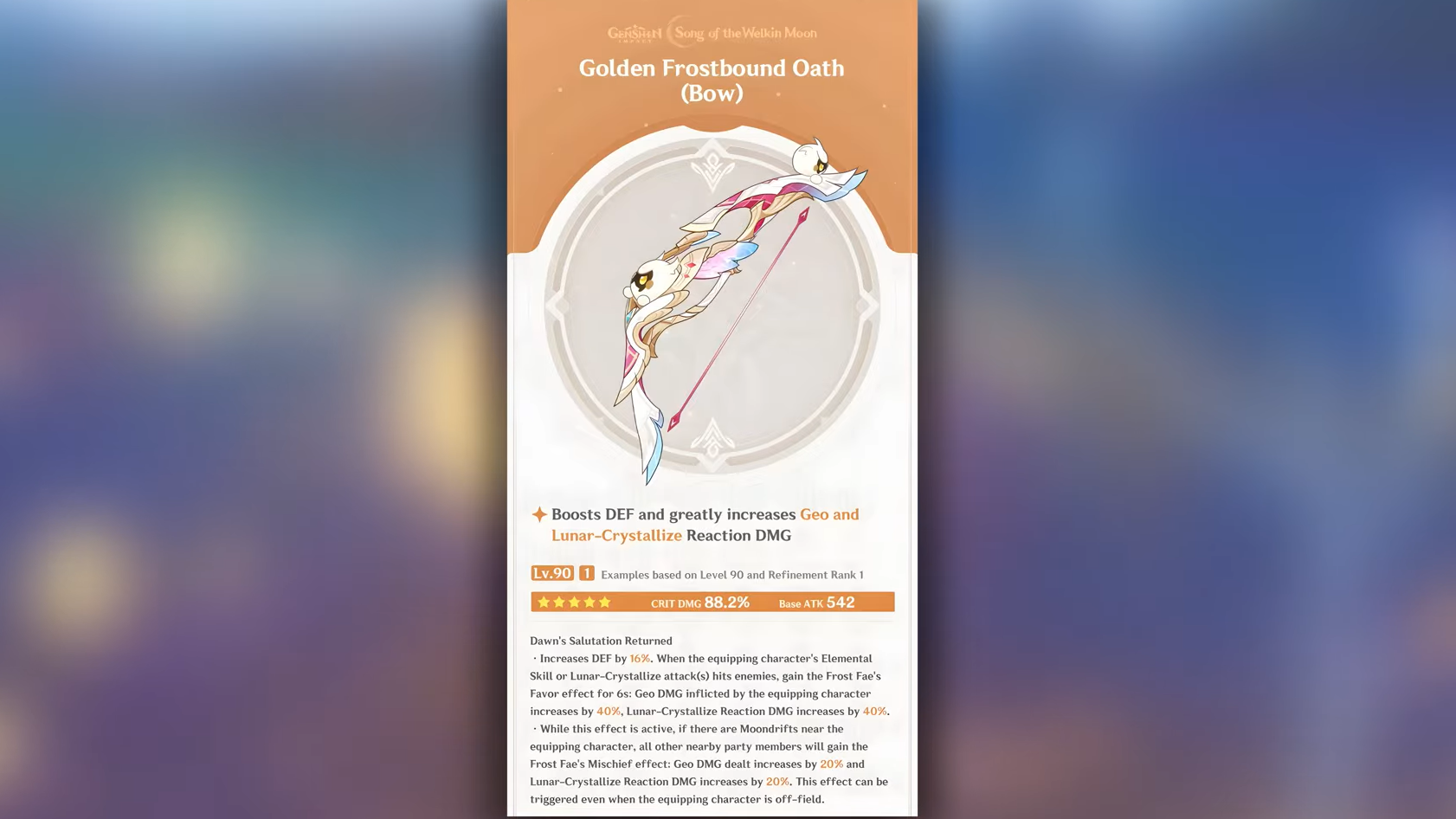 That said, Lunar-Crystallize reaction damage ignores conventional DMG% bonuses in its scaling formula. This means the partywide buff from Golden Frostbound Oath specifically targets the Lunar-Crystallize Reaction DMG multiplier rather than generic elemental damage. It is powerful within Lunar-Crystallize teams but does absolutely nothing outside of them. You cannot repurpose this bow as a stat stick for other DPS characters because the passive is entirely Geo- and Lunar-Crystallize-locked.