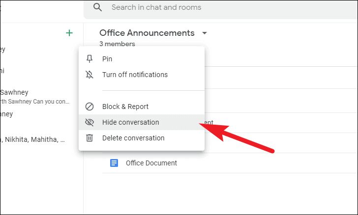 To hide a conversation, click on the kebab menu (three vertical dots) present on the far right side of the chat name of the person on the sidebar. Next, click on ‘Hide conversation’ option from the list.