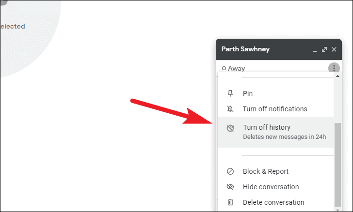 Click on the kebab menu (three-vertical-dots) from the corner of the chat pane and click the ‘Turn off history’ option from the list. This will delete the messages in 24 hours, starting from the time they were sent.