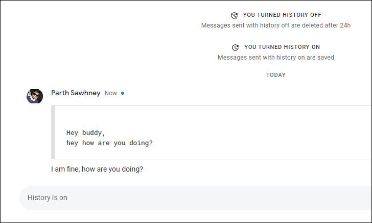 Note: Only those messages would be deleted which were sent after the history has been turned off. Messages present in the chat before turning off history would not be affected.