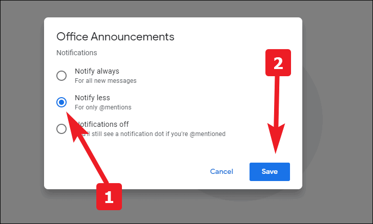 Now, click on the ‘Notify less’ option to only receive notifications when you are mentioned. Next, click on save to confirm your changes.