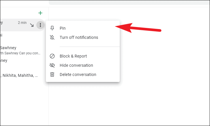 To pin a Room, group, or chat click on the kebab menu (three-vertical-dots) situated right next to the Room name and click on the ‘Pin’ option from the list.