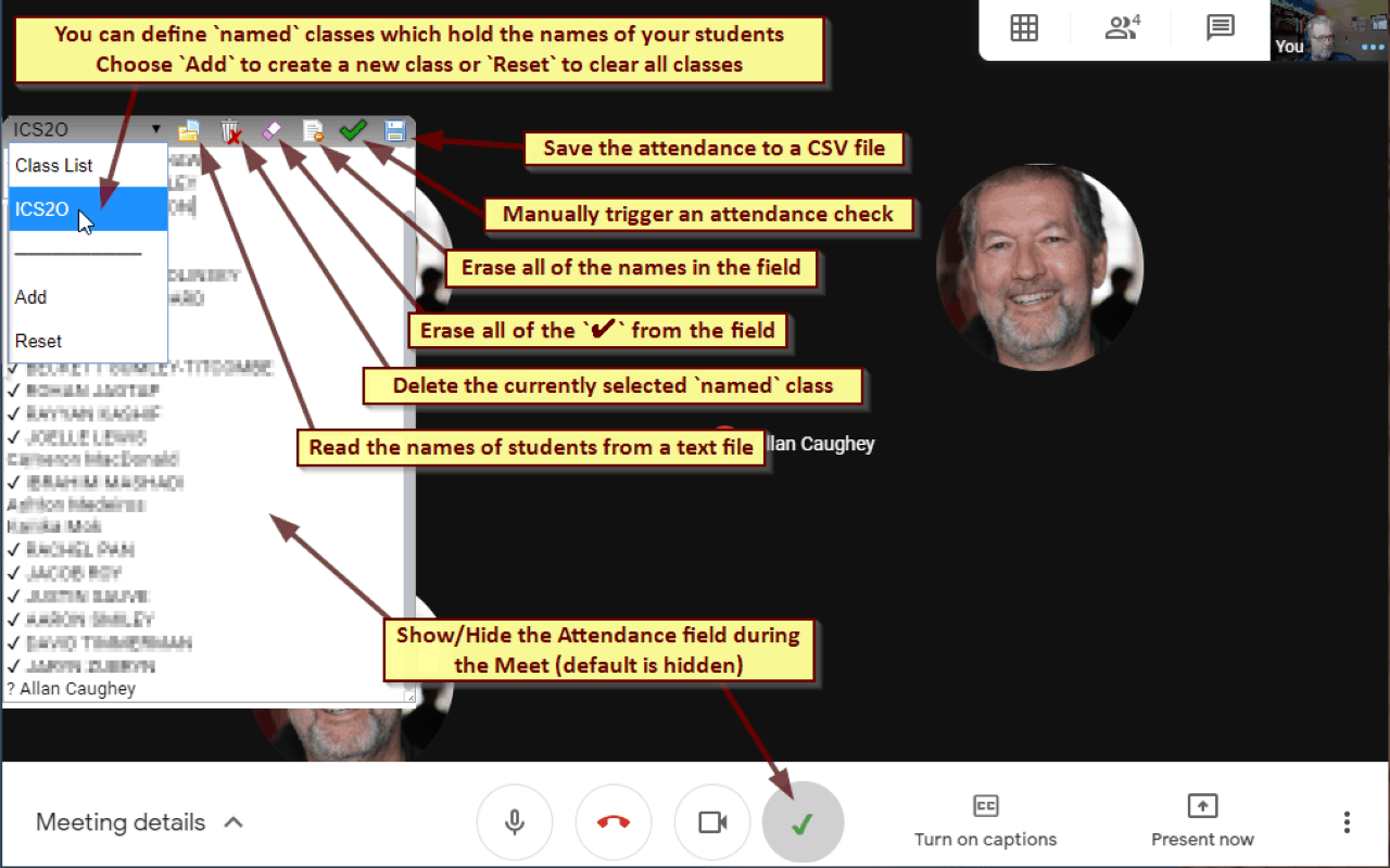 This add-on also has a couple more features such as clearing a given class list or even removing the automated attendance checkmarks. There is also an option to hide the attendance list from an ongoing meeting. This can be done by clicking on the ‘tick’ mark at the bottom of a live Google Meet session.