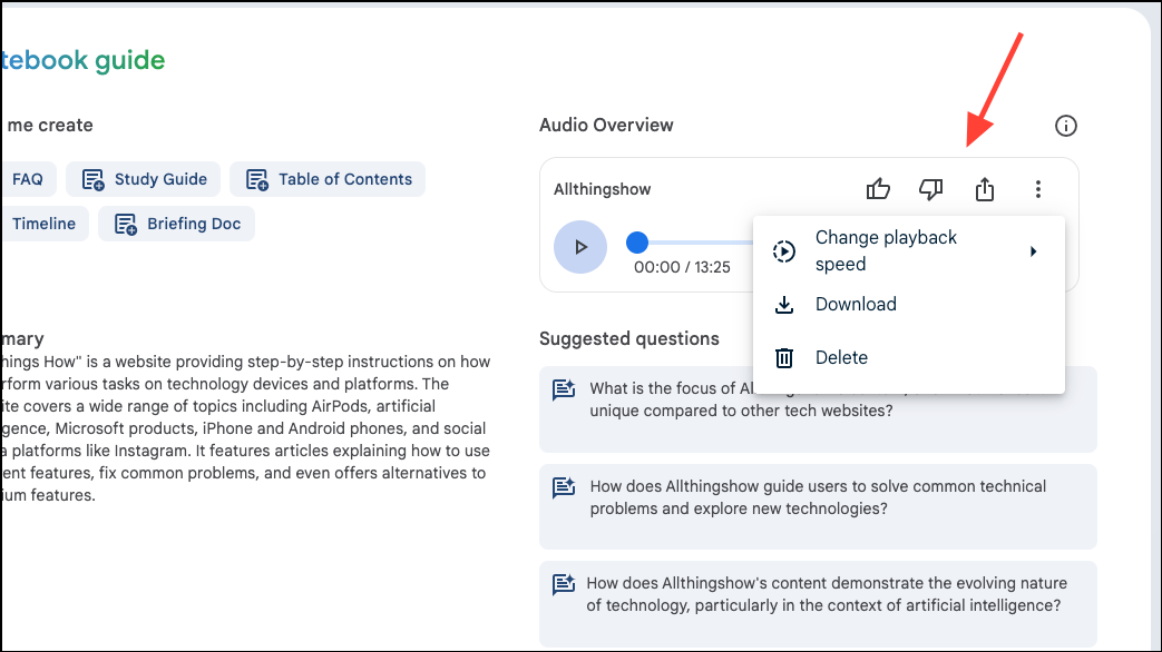 - Once the podcast is generated, you can listen to it, change the playback speed, share it, or download it.