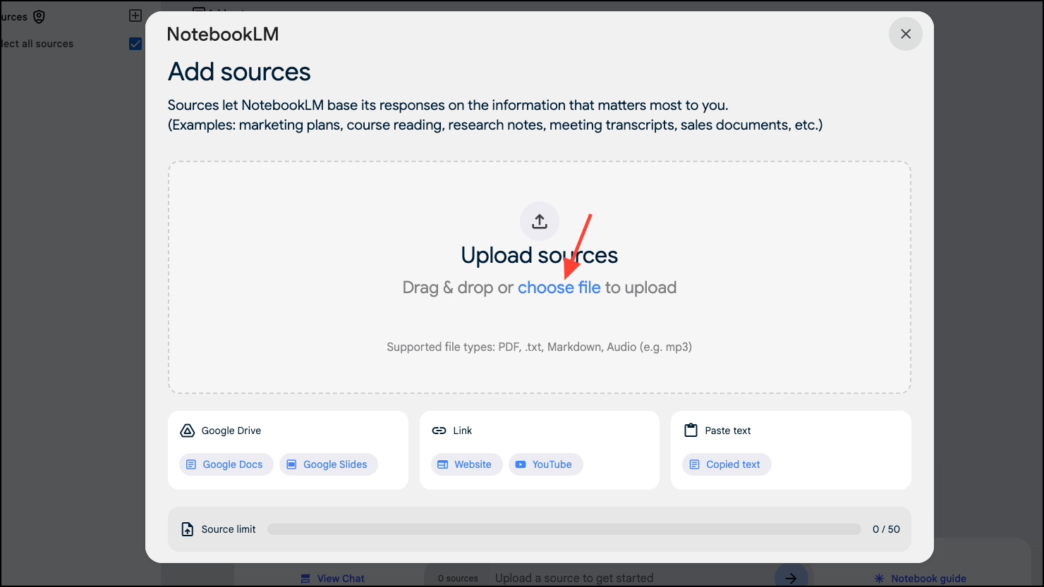 - Then, upload your sources using the 'Add sources' dialog box.
