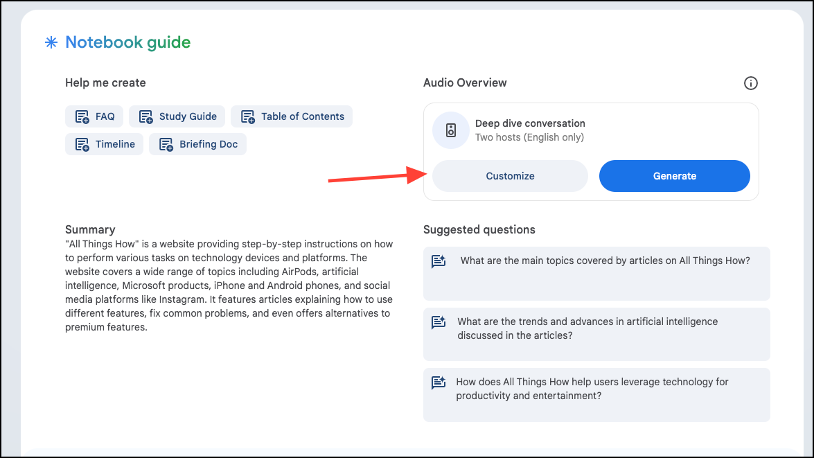 - Click on 'Customize' to provide a prompt to the AI hosts if you want.