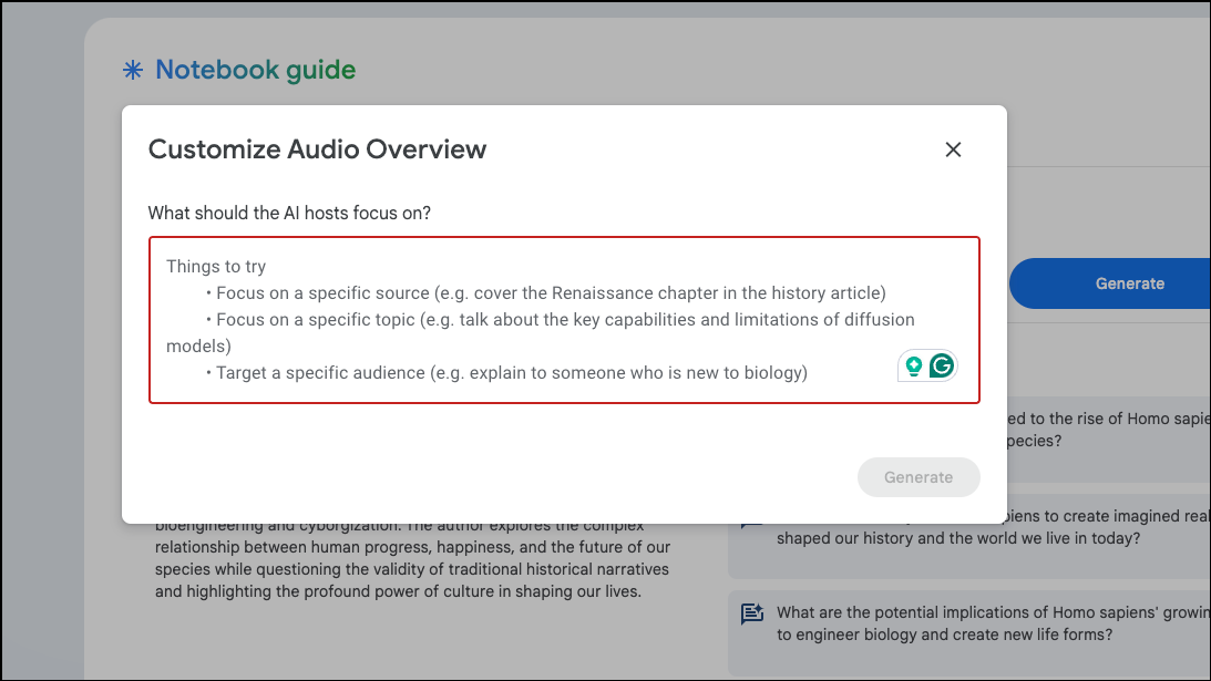- A prompt box will appear where you can ask the AI hosts to focus on a specific source or chapter from a source, tone, or target audience and click on the 'Generate' button.