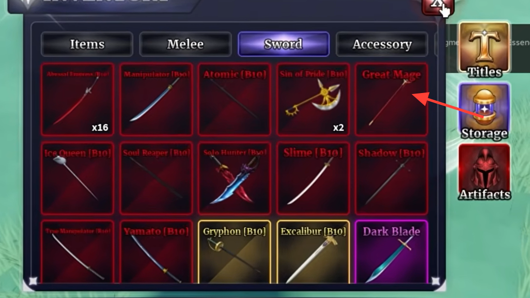 Step 3: Select the Great Mage sword and confirm the purchase. The sword lands in your inventory immediately with all moves unlocked.