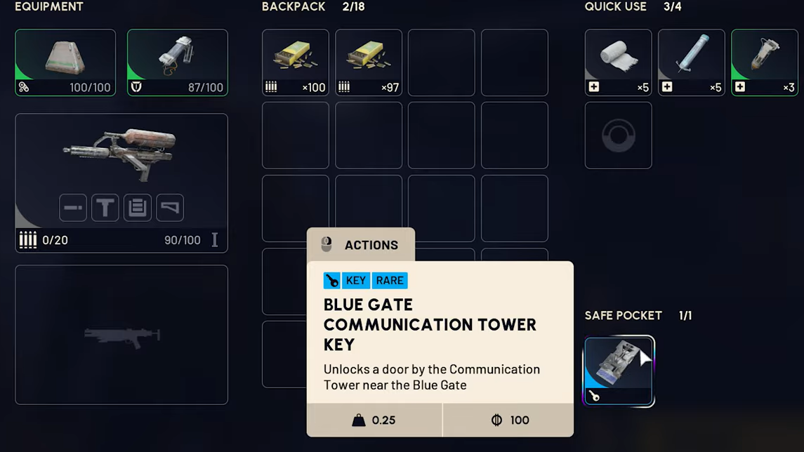 Step 2: Before you leave Speranza, move the Blue Gate Communication Tower Key from your stash into your loadout and then into a safe pocket augment slot. Double-check it is in the safe pocket, not in regular inventory, so a death on the way to Pilgrim’s Peak doesn’t set you back.