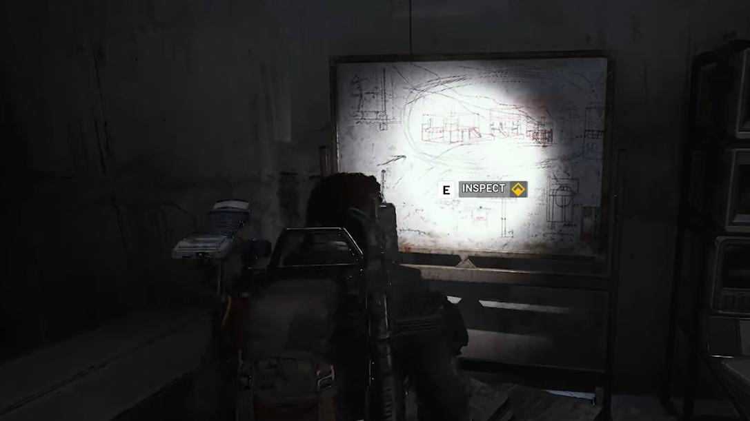 Step 1: Once you are inside the locked room, look to the right-hand side. The room is small, packed with equipment and loot, but there is a single whiteboard on the wall with a sketch of an unfinished building or house. This whiteboard counts as the “construction research” mentioned in the quest log.