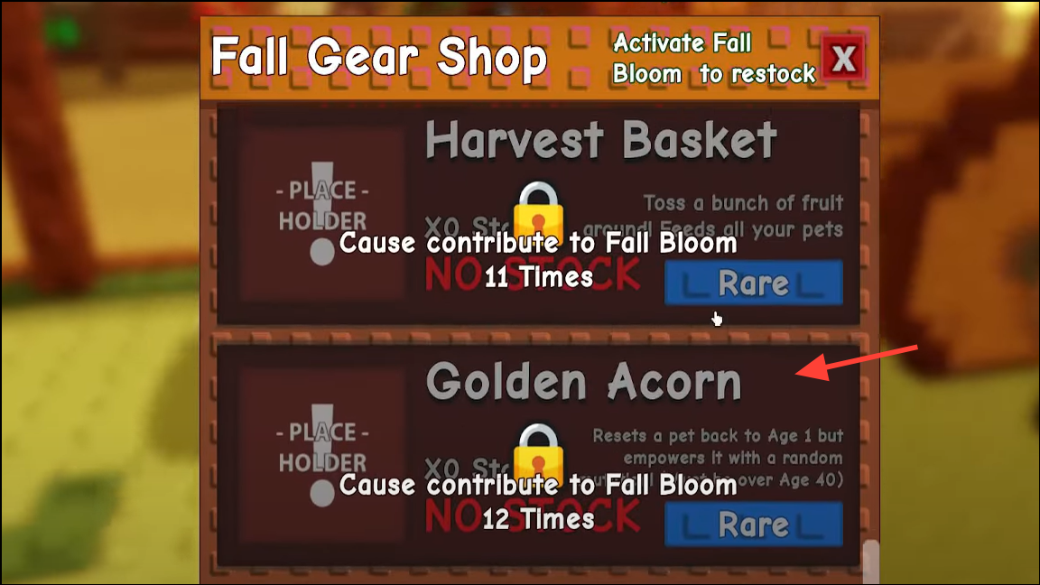 Step 3: Check stock and purchase the Golden Acorn. If available, buy it for 10 billion Sheckles. If you prefer, it can also be purchased for 239 Robux. If it’s out of stock, contribute to Fall Bloom again or check back after the next restock window.