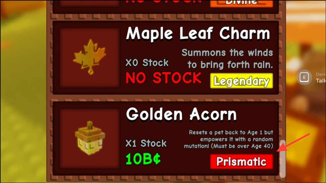 The Golden Acorn applies mutations earlier than the typical mutation machine threshold, letting you test mutations once a pet crosses the Age 40 line. Because the result is random, choose pets where you’re comfortable rerolling outcomes. The 10 billion Sheckles price point is steep—consider saving for event restocks and keep a variety of plant types ready to fulfill Fall Bloom requests efficiently. If you encounter stock outages, check the shop after you contribute to Fall Bloom again.
