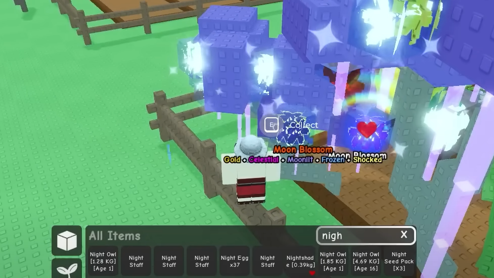 - Anchor gear: keep a Lightning Rod (for Shocked), a Star Caller (for Celestial at nightfall), and a Night Staff (for Moonlit) on the plot. Basic/Advanced/Godly/Master sprinklers help weight and variant rolls.