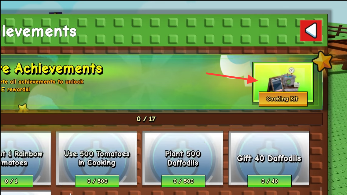 The Cooking Kit isn’t sold at the Cosmetics Stall. You get it from Achievements in your Garden Guide, which are separate from Roblox badges.