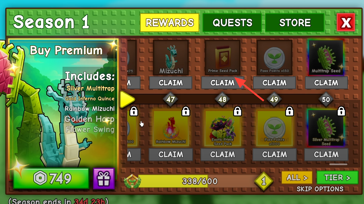 You can earn multiple Prime Seed Packs directly from the free Season Pass track. The premium track swaps those placements for Exotic Prime Seed Packs at similar tiers. Progress comes from Season Pass quests; quests reset daily and award 250 XP each, and you can pay Robux to skip quests or tiers if you want to rush. The premium Season Pass itself costs 749 Robux.