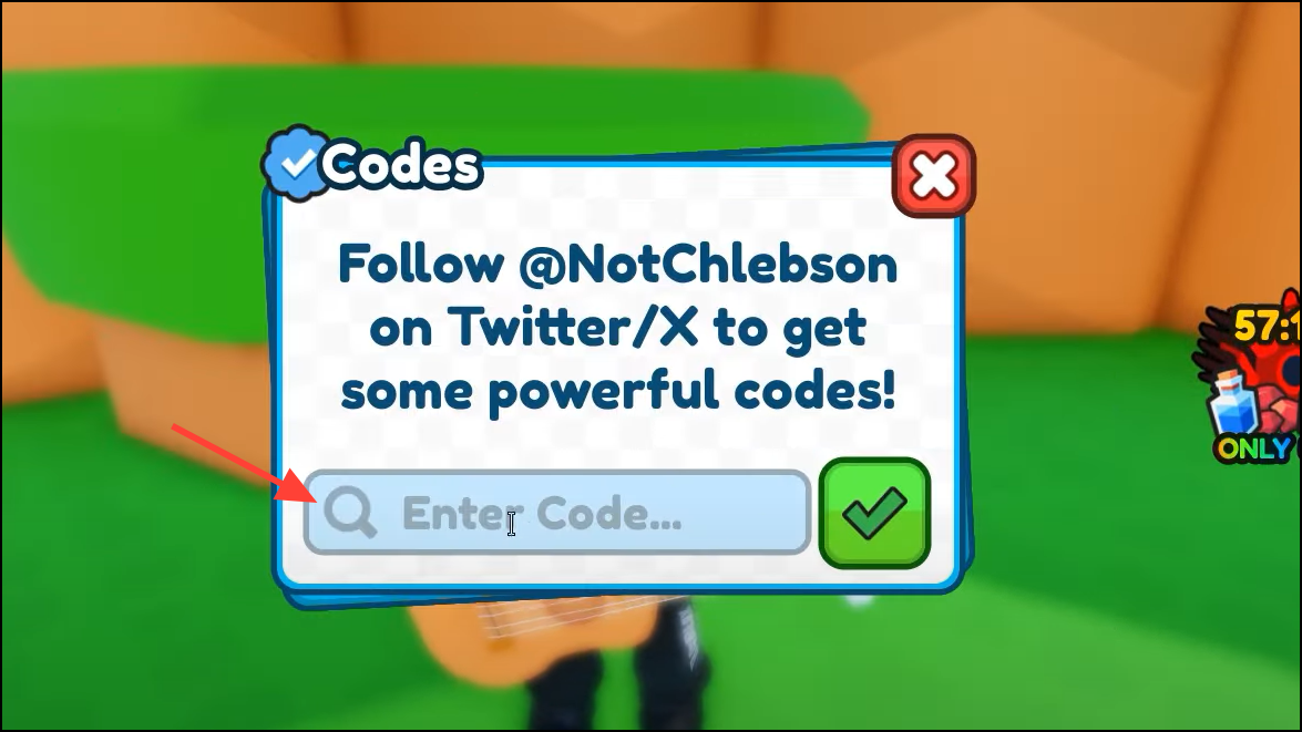 Step 2: Look for a Codes, Shop, Settings, or Twitter/X icon in the game UI, or approach the in‑game code terminal/booth.