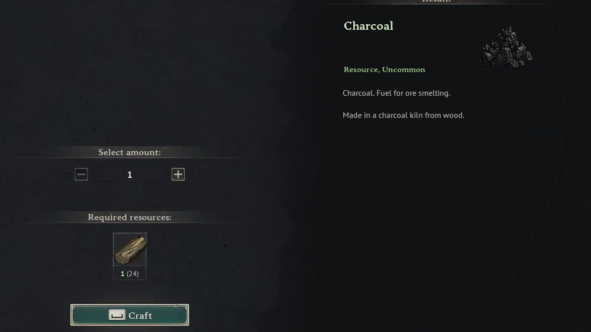 | Fuel | Charcoal / Ash (Charcoal Kiln) | 1 per unit |