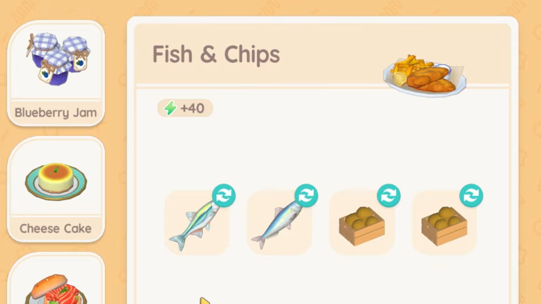 - Fish and chips unlocks as a paid recipe very early in the cooking track (around level 1). It uses basic fish and potatoes from your garden and sells for far more than the ingredients alone. Players consistently report plate prices around the mid-hundreds of gold.