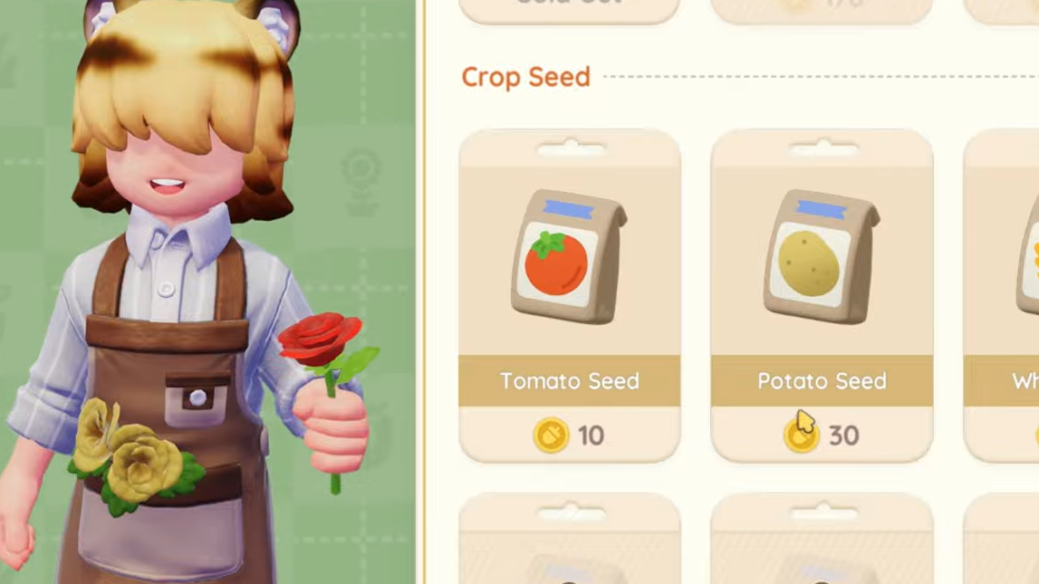 Gardening unlocks through Blanc during the tutorial. He provides a watering can and sells seeds and farming tools. Garden plots start small and expand gradually, so early optimization matters.