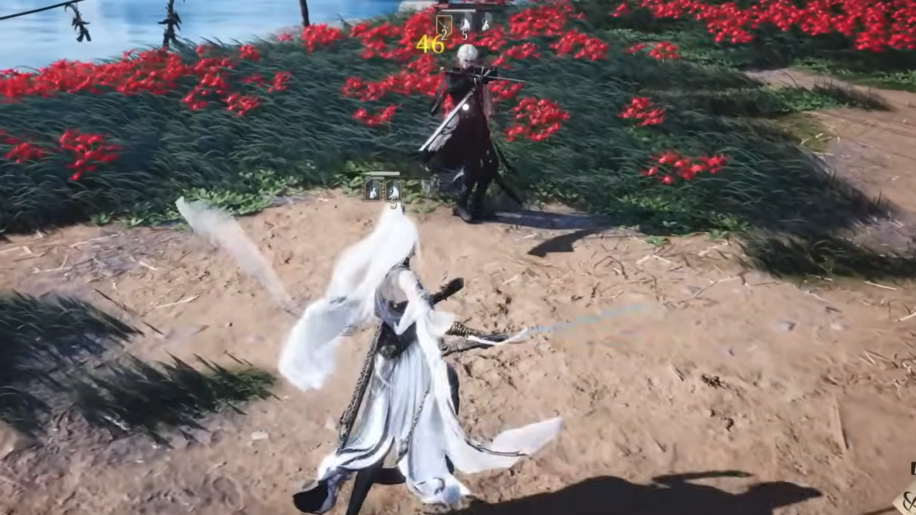 - Two-handed weight and range. The animation set is heavier and more committed than the single-handed sword kits, sitting closer to the feel of a parry-focused greatsword or “katana stance” in other action RPGs.