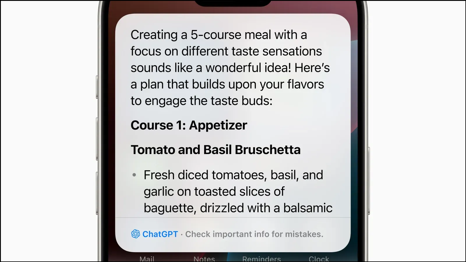 For instance, you can ask Siri how can I create a 5-course meal with a focus on different taste sensations? and the chatbot will ask you whether you want to connect with ChatGPT to get the answer. If you give it permission, it will show you the answer on your screen.