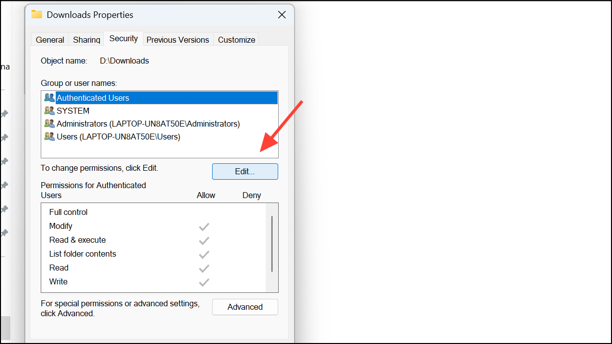 Step 2: In the Properties window, switch to the Security tab. Here, you can view and modify which users or groups have access to the folder. Click Edit to change permissions.