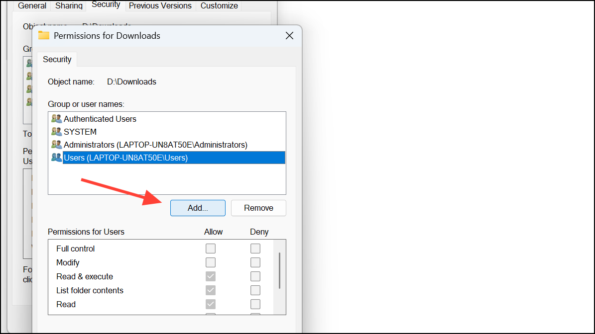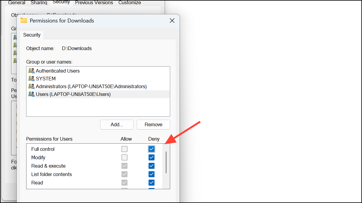 Step 4: With the user selected, check Deny for Read and any other permissions you want to block. This prevents the chosen user from opening or viewing the folder’s contents. Click Apply and confirm the changes. The folder is now inaccessible to that user, even if they know the location or try to access it directly.