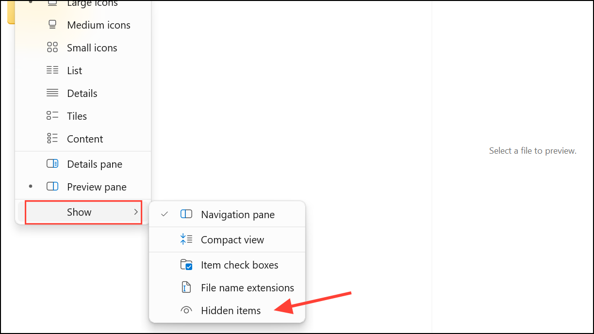 Step 3: To make hidden folders invisible, open File Explorer, click the View tab, and ensure Hidden items is unchecked. Most users will not see the hidden folder unless they change this setting.