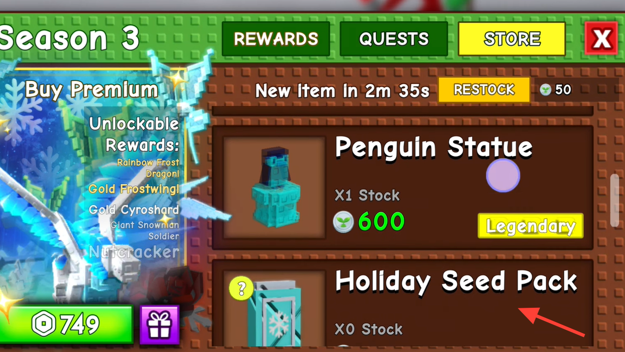 Season Pass Shop purchase: the Holiday Seed Pack can be purchased for 150 Pass Points or 199 Robux. The shop has a stated 20% chance to restock the pack.