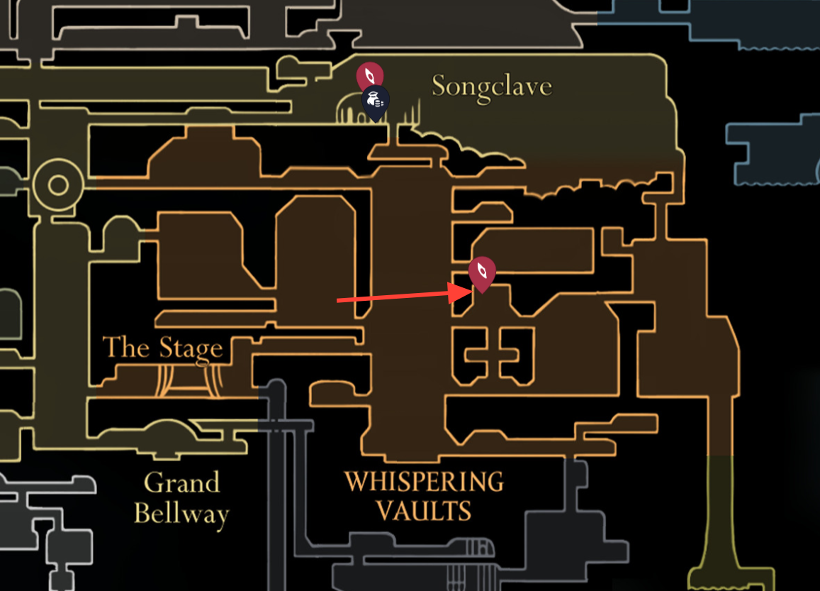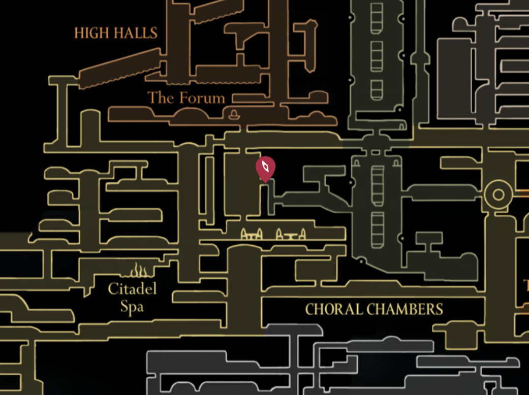 Step 1: From the tall tower under Songclave, enter the second room from the bottom on the right.