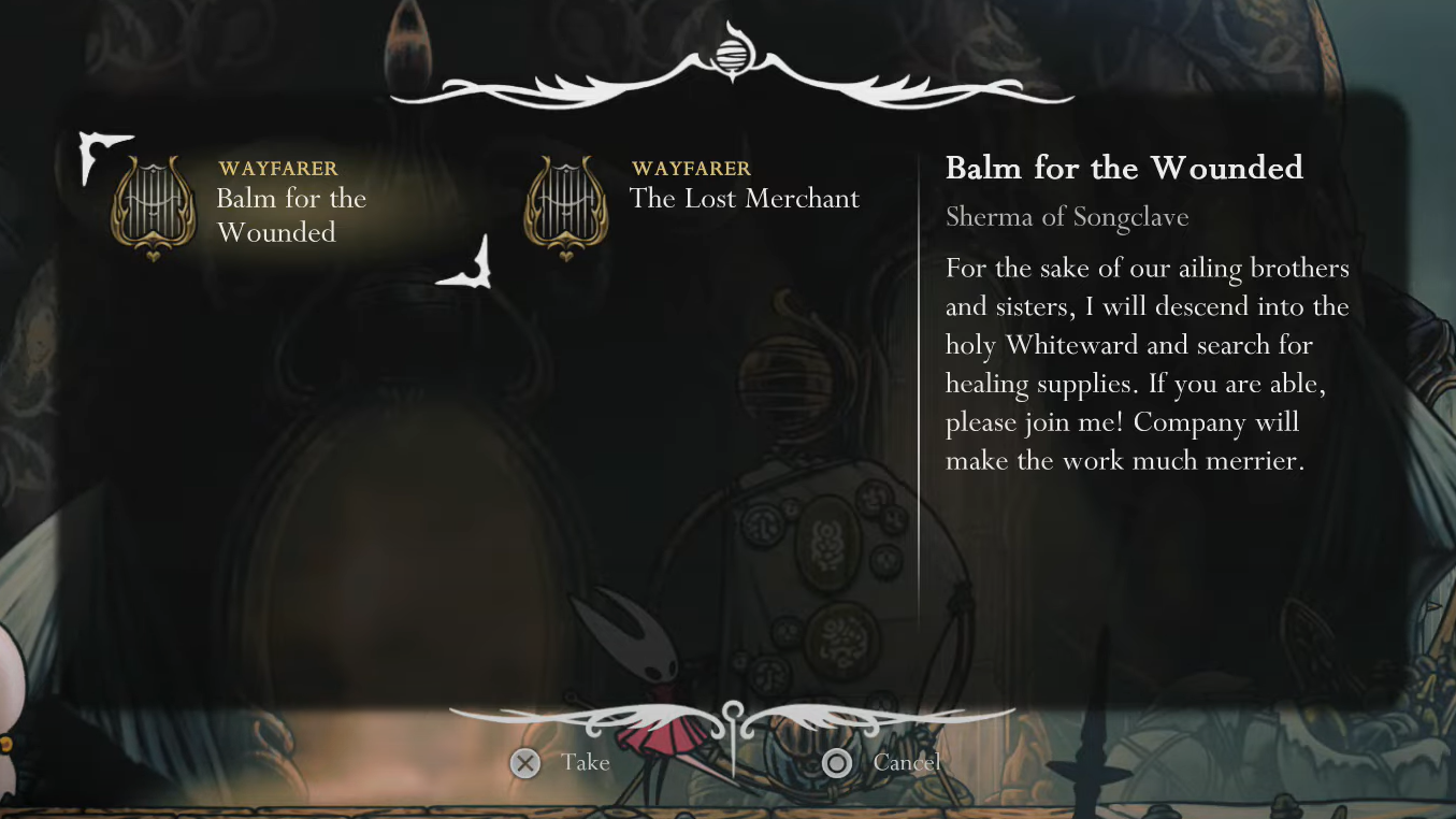 Once these are handled, return to the Songclave Wish Board and accept Balm for the Wounded.
