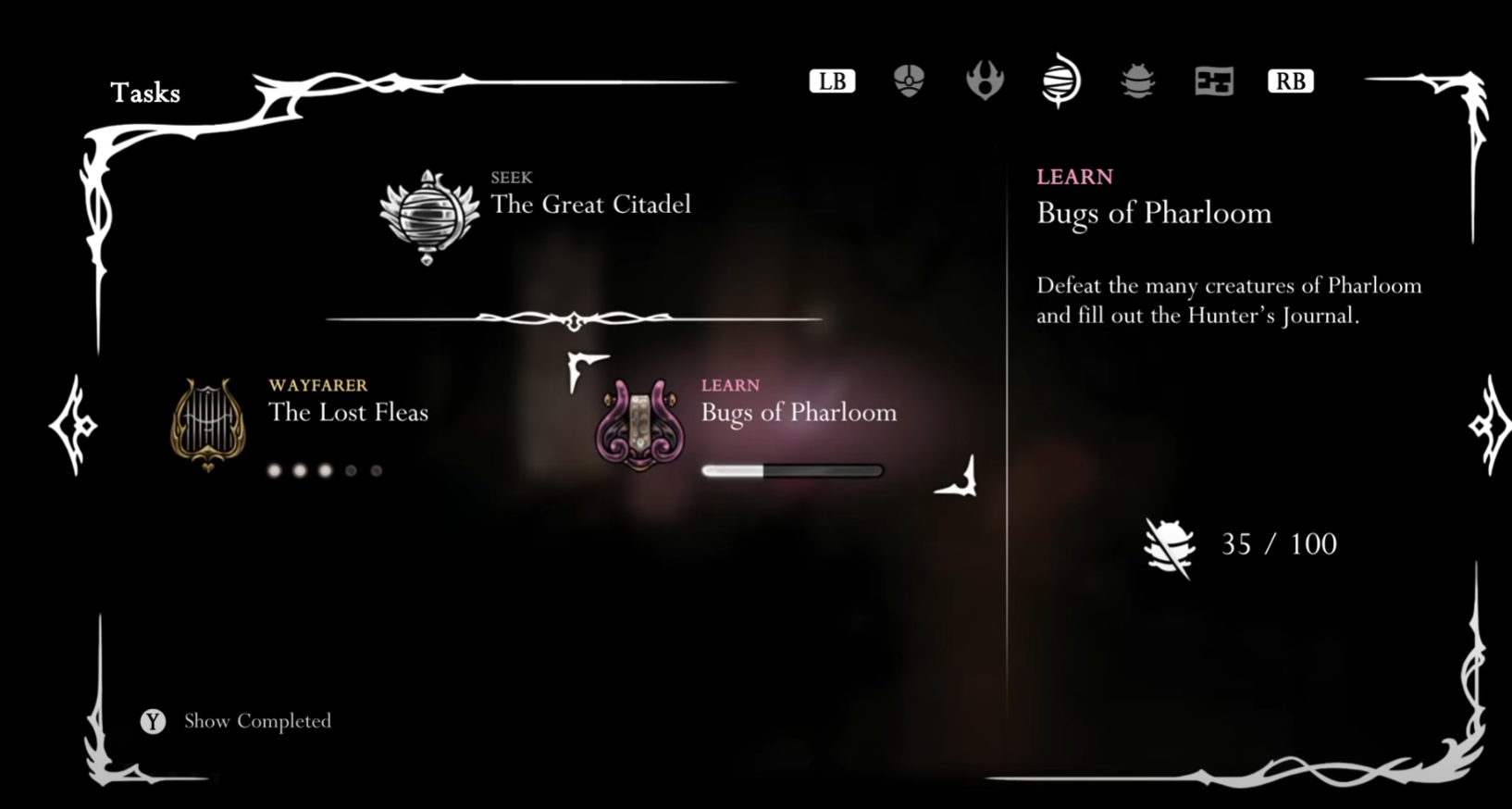 Step 4: Return to the main thoroughfare and continue to “Halfway Home” (the lodgings). Rest at the bench on the right, speak with Creige, then climb to the roof to meet Nuu and accept the Wish “Bugs of Pharloom.” This grants the Hunter’s Journal.