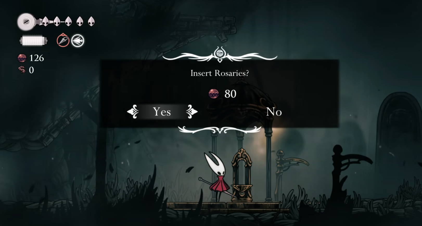 Step 3: From the next screen’s bottom-left exit, head up through the inner platforms to reach a nearby room with a fast-travel station. Pay 80 Rosaries to activate it.
