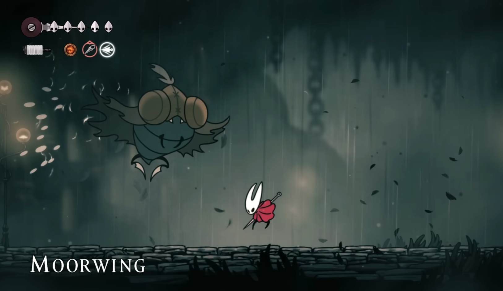 Step 2: Lure Moorwing to the far side below you. From the extreme ledge, use short hops and down-strikes or arc slashes to tag him when he drifts close, retreating after each hit to avoid counterblades.