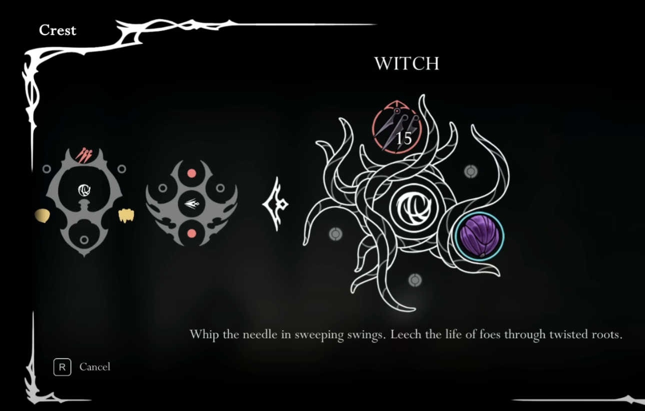 The Witch Crest grants Hornet sweeping whip‑like swings and on‑hit life drain. It provides two red tool slots and three blue tool slots. Its in‑game text reads: “Whip the needle in sweeping swings. Leech the life of foes through twisted roots.”