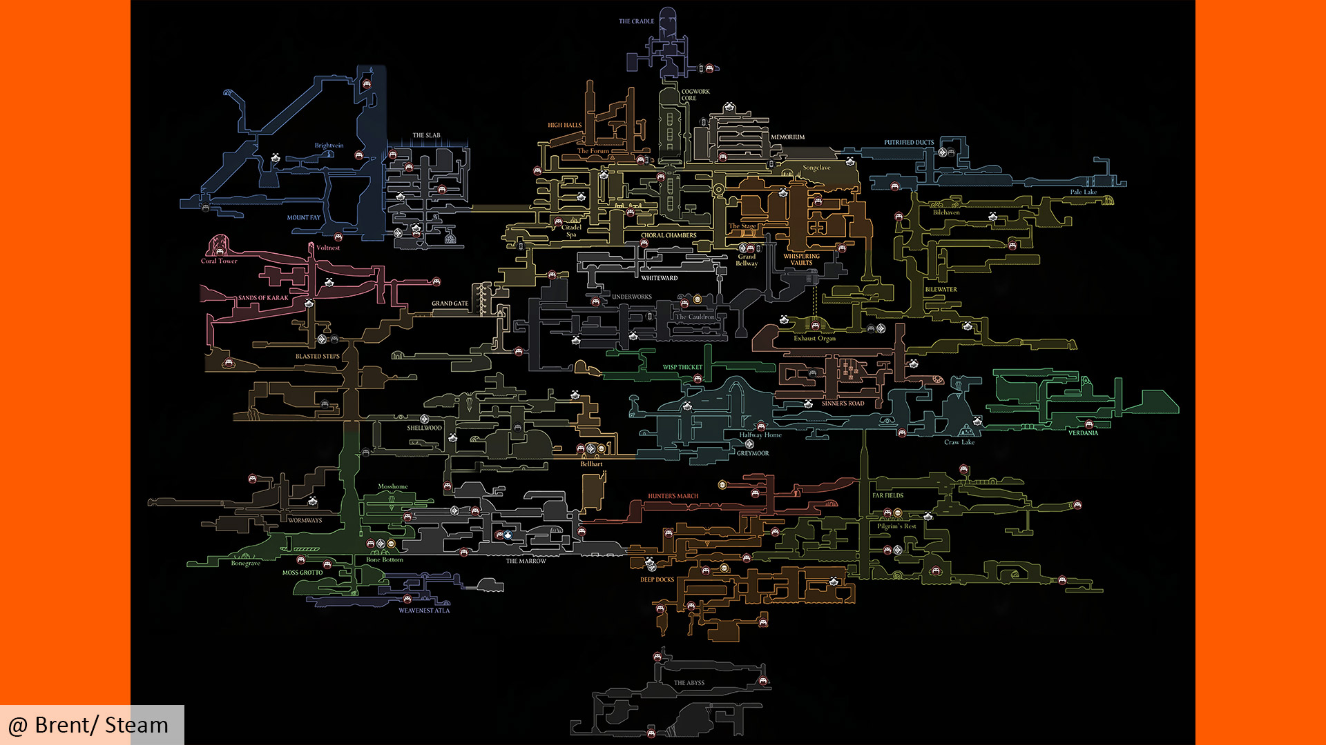 Silksong’s map comprises dozens of distinct regions and sub-areas, interleaved vertically in a sustained climb. Several zones branch into tucked-away pockets that only open after story milestones or once you’ve picked up new movement abilities. That means the “complete map” you see circulating is accurate as a whole, but your personal version will fill in piecemeal and out of order, and some connections don’t make sense until much later.