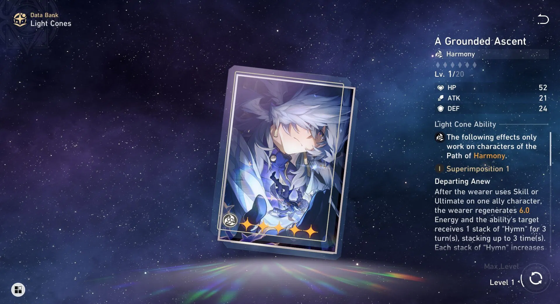Most Harmony units target allies with Skills or Ultimates by design, so characters such as Sunday, Bronya, Sparkle, Robin, Tingyun and Harmony Trailblazer can all trigger the effect consistently. Testing shows that in hypercarry teams, A Grounded Ascent can outperform traditional Harmony staples such as But the Battle Isn't Over by a significant margin, thanks to extra Energy and team-wide damage uptime rather than only buffing one rotation.