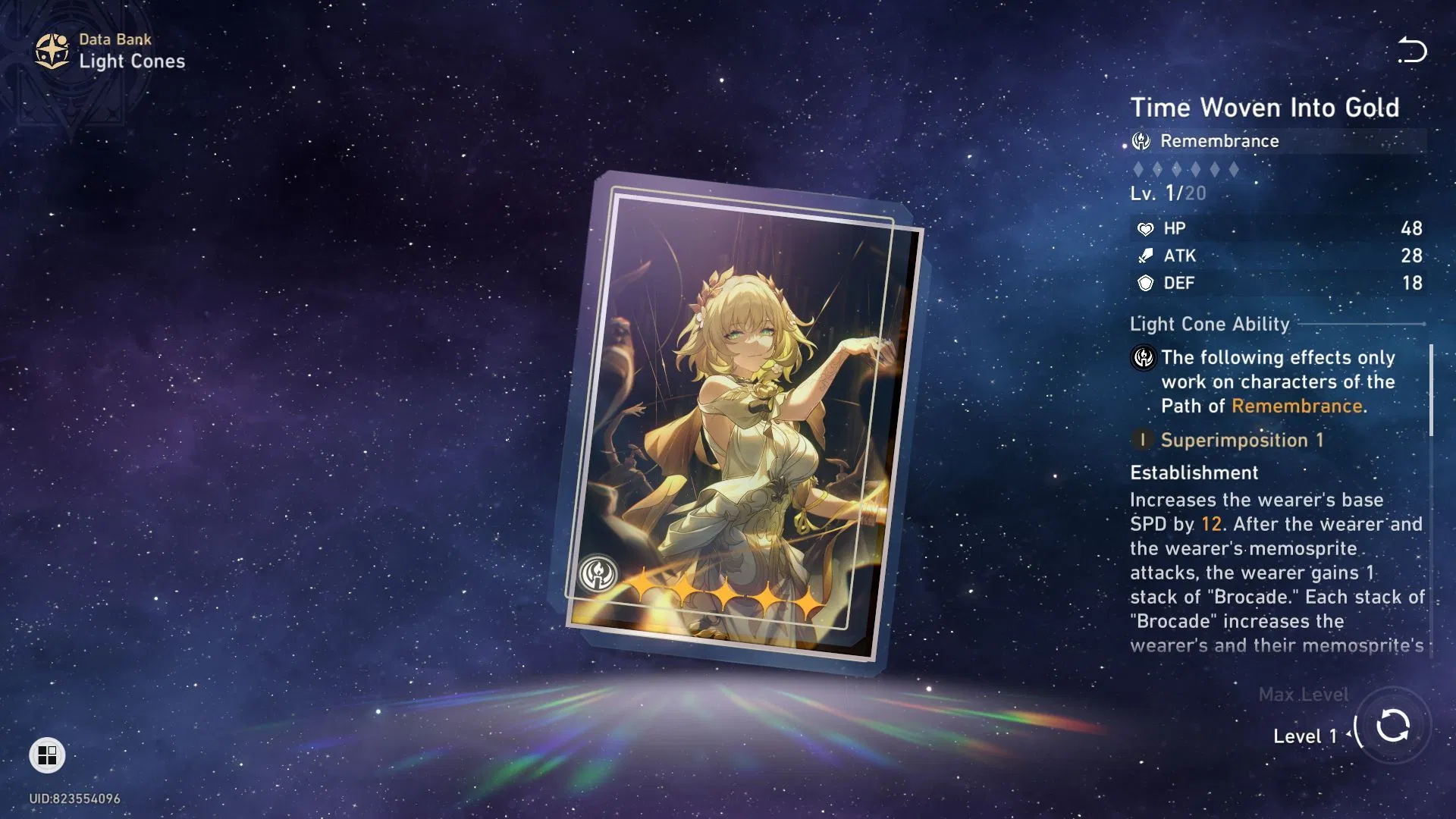 Time Woven Into Gold is Aglaea’s signature Remembrance Light Cone and focuses on improving her unique playstyle. Its main strengths are a combination of Speed and critical damage for the wearer, tailored to characters who repeatedly control the field through Skills and Ultimates rather than relying on basic attacks.