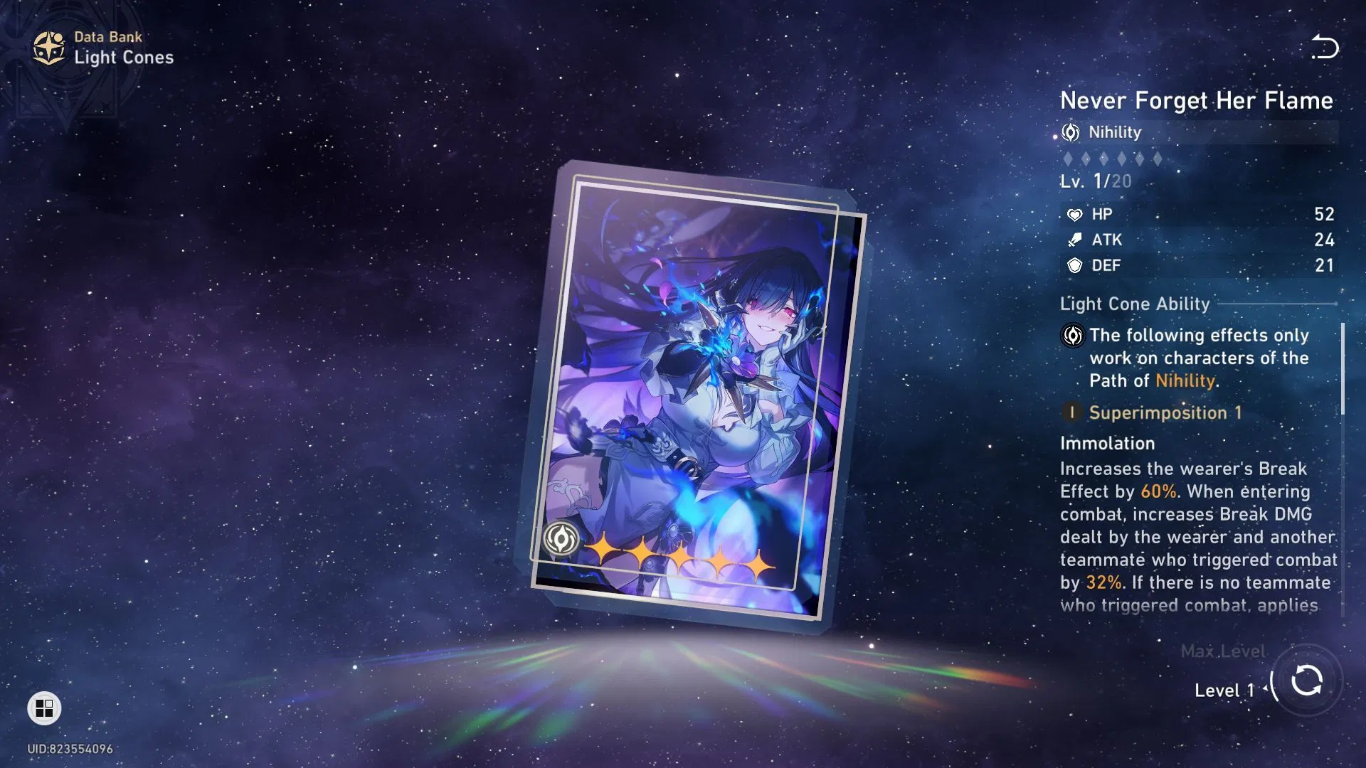 Never Forget Her Flame is the new 5-star Nihility Light Cone introduced in Version 3.8 and functions as The Dahlia’s signature weapon. It is a Break-focused support option aimed at Nihility characters who scale with Break Effect.
