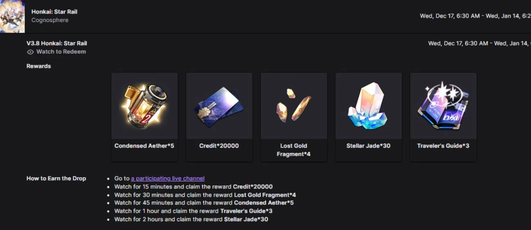 | HSR 3.8 Twitch Drops | December 17, 2025 | January 14, 2026 |
