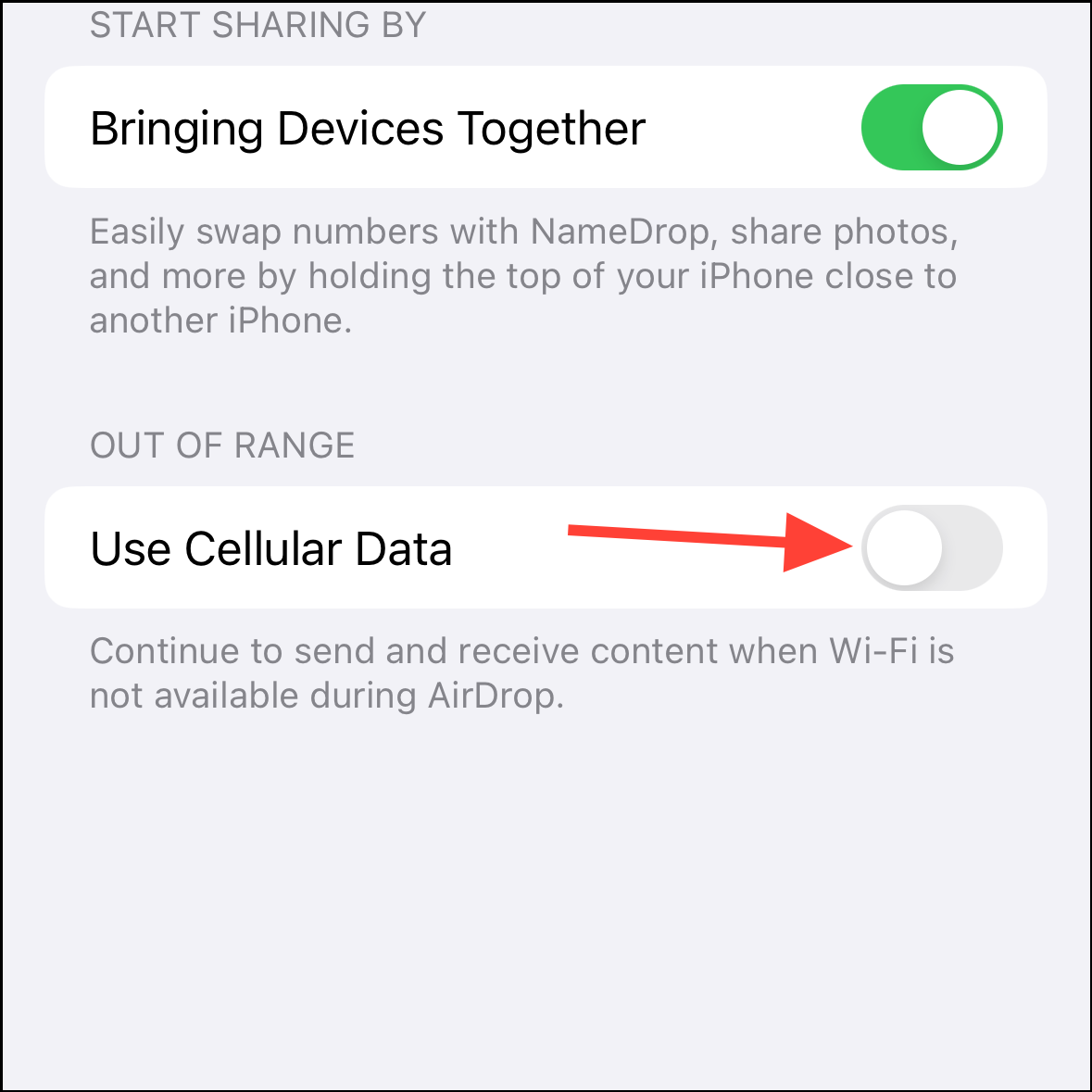 - Here, you'll find a toggle for 'Use Cellular Data' under the 'Out Of Range' section. Disable it, and AirDrop won't be able to continue to send and receive content over mobile data when Wi-Fi becomes unavailable.